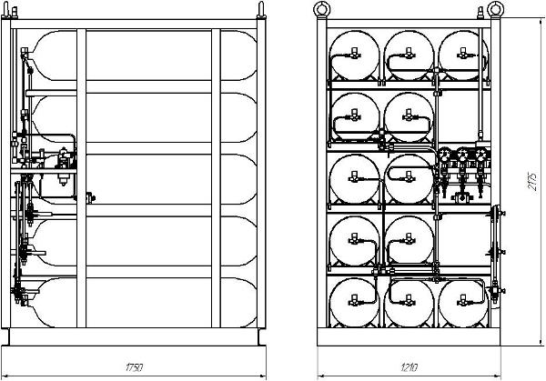 Блок аккумуляторов газа - предназначен для хранения запаса сжатого до 25,0 МПа (250 кгс/см2) газа и увеличения, вследствие этого, количества заправляемых автомобилей. В качестве емкостей служат газовые баллоны объемом 0,1 м3 каждый. Для ускорения процесса заправки (использования двух- или трех-линейной схемы) аккумуляторный блок АК может быть разбит на две или три секции.